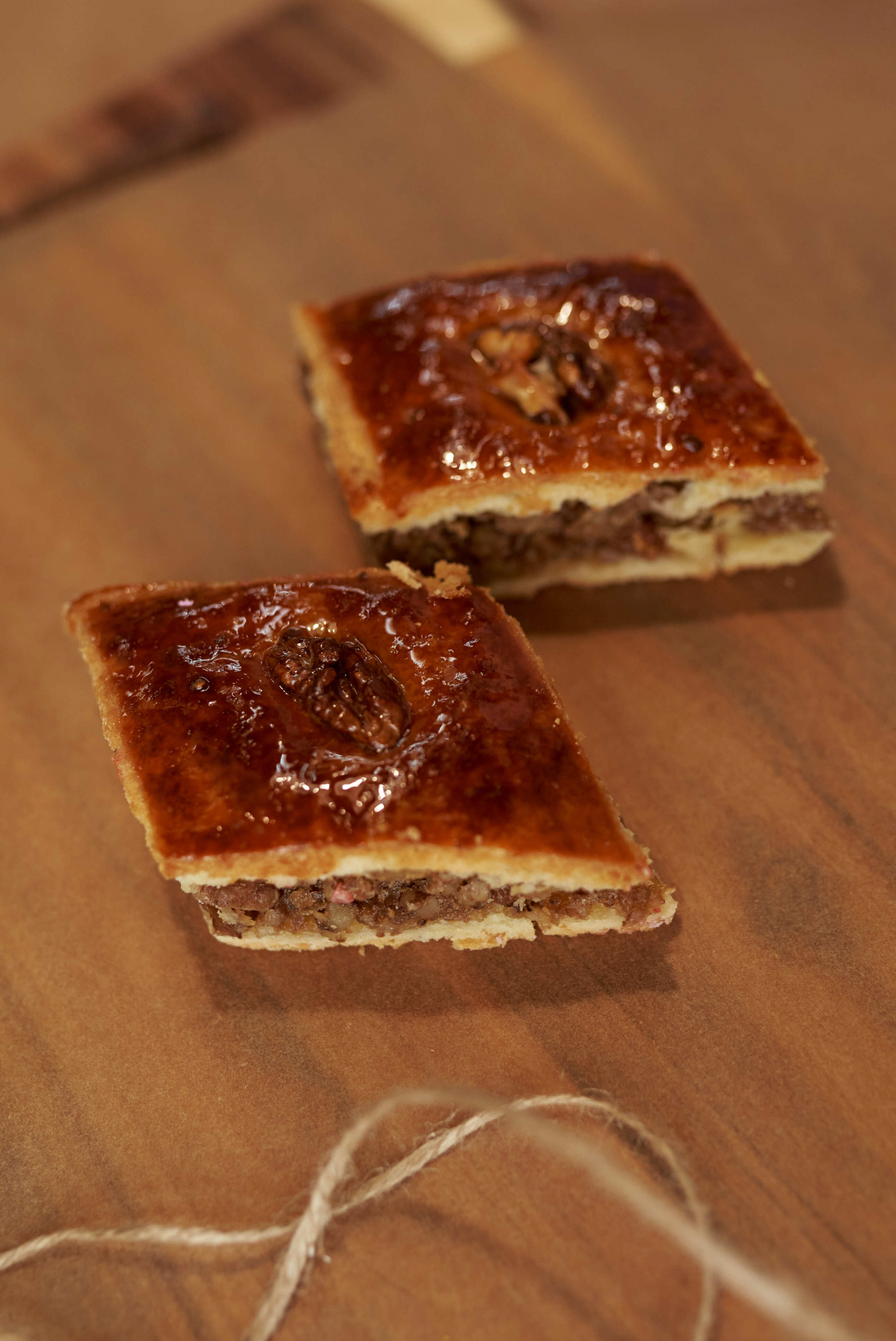 Состав: Тесто слоеное, грецкий орех, изюм, мед.