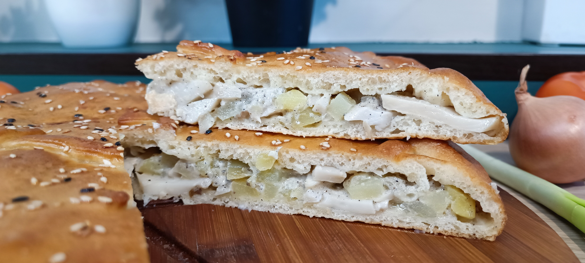 Главная / Интернет-магазин / Пироги / Пироги из слоеного теста / Пирог с картофелем и грибами сл. т. 1кг